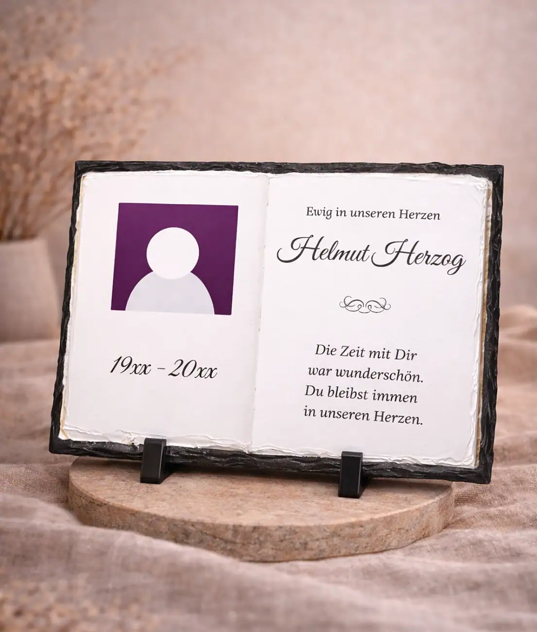 Bei Memento Trauerkarten werden Gedenktafeln aus hochwertigem Schiefer gefertigt und mit modernen Druckverfahren individuell gestaltet. Durch den präzisen Druck können Fotos, Namen, Lebensdaten und persönliche Worte dauerhaft auf der Oberfläche sichtbar bleiben.