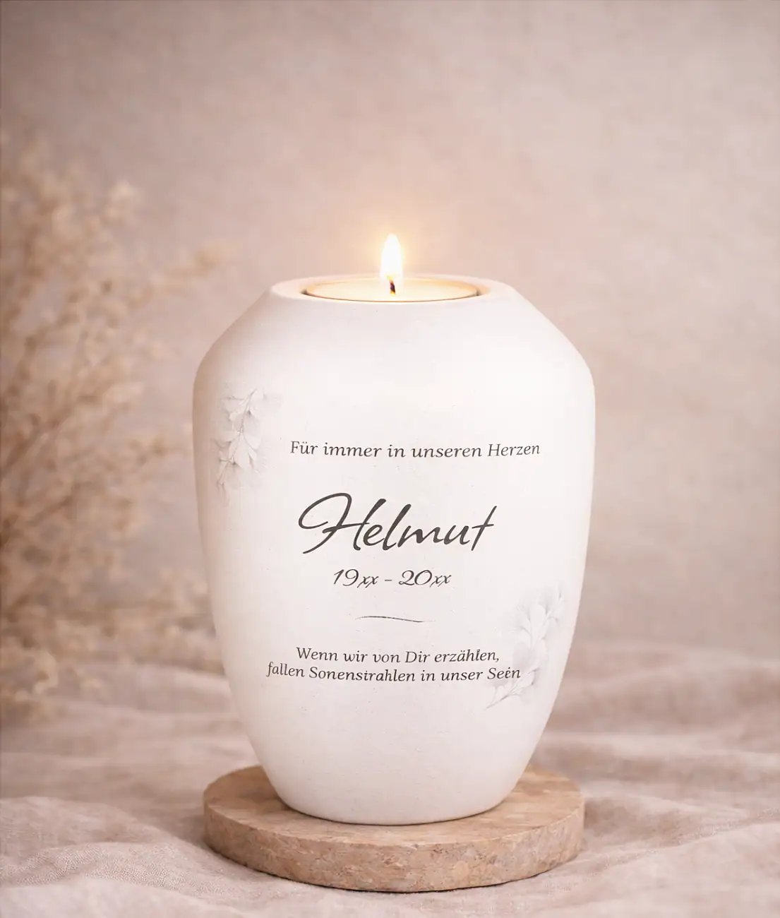 Durch die Kombination aus persönlicher Beschriftung und symbolischem Motiv entsteht ein individuelles Erinnerungslicht, das die Erinnerung sichtbar bewahrt. Die schlichte, zeitlose Gestaltung sorgt dafür, dass sich das Gedenklicht harmonisch in verschiedene Räume einfügt und dennoch eine sehr persönliche Bedeutung trägt.