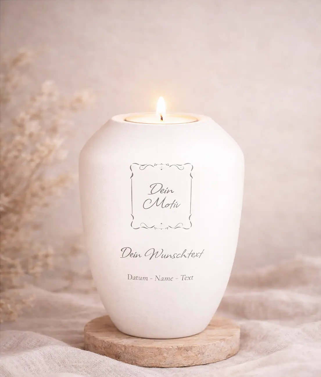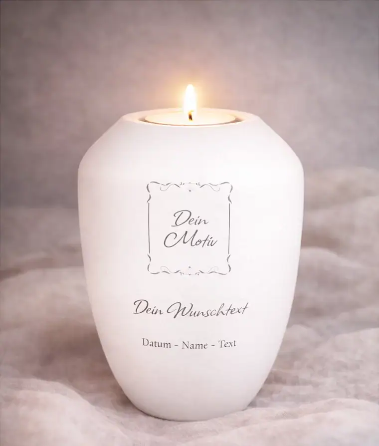 Gedenklicht „Kreativ“ zum Selbstgestalten. Gestalten Sie Ihr persönliches Erinnerungslicht mit eigenem Motiv, Namen, Lebensdaten und individuellem Text. Ein würdevoller Weg, die Erinnerung an einen geliebten Menschen sichtbar zu bewahren.