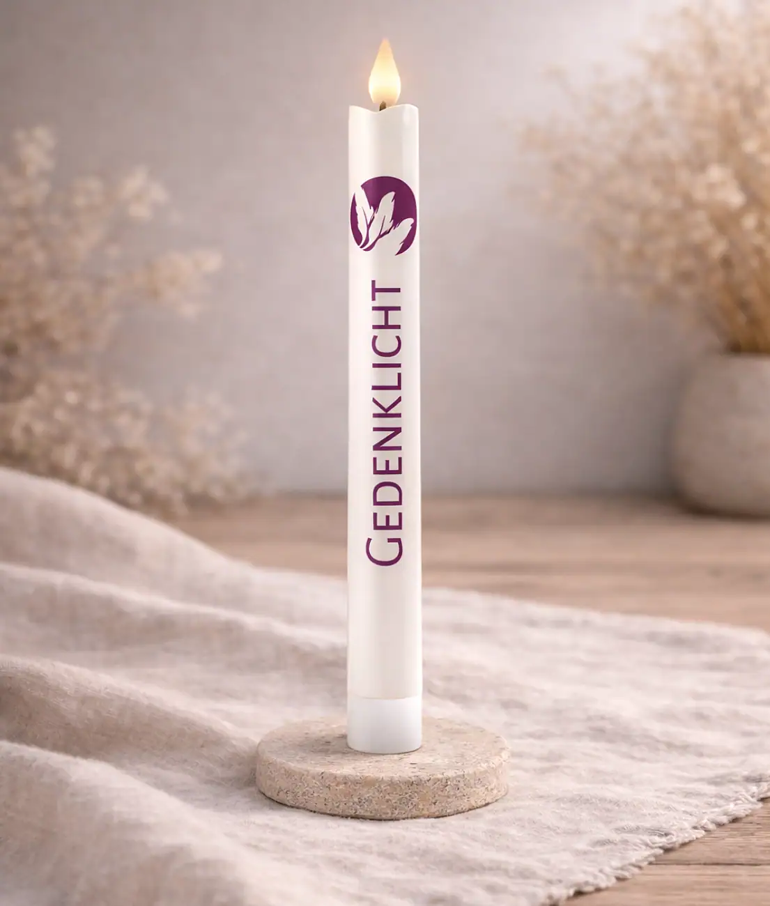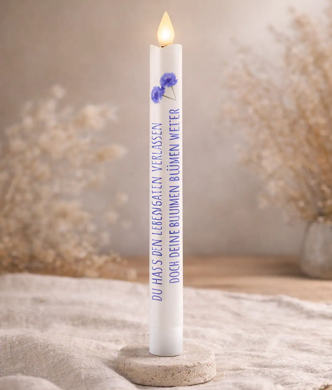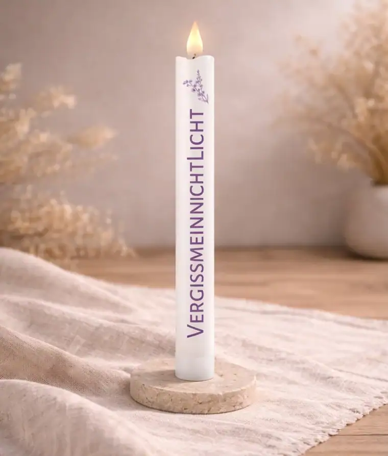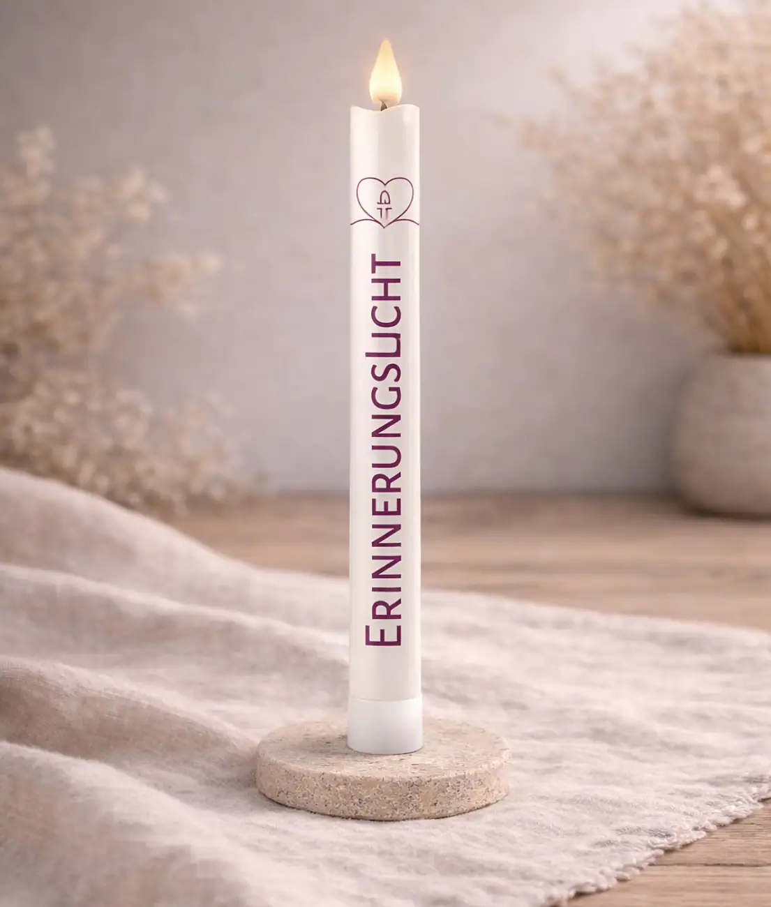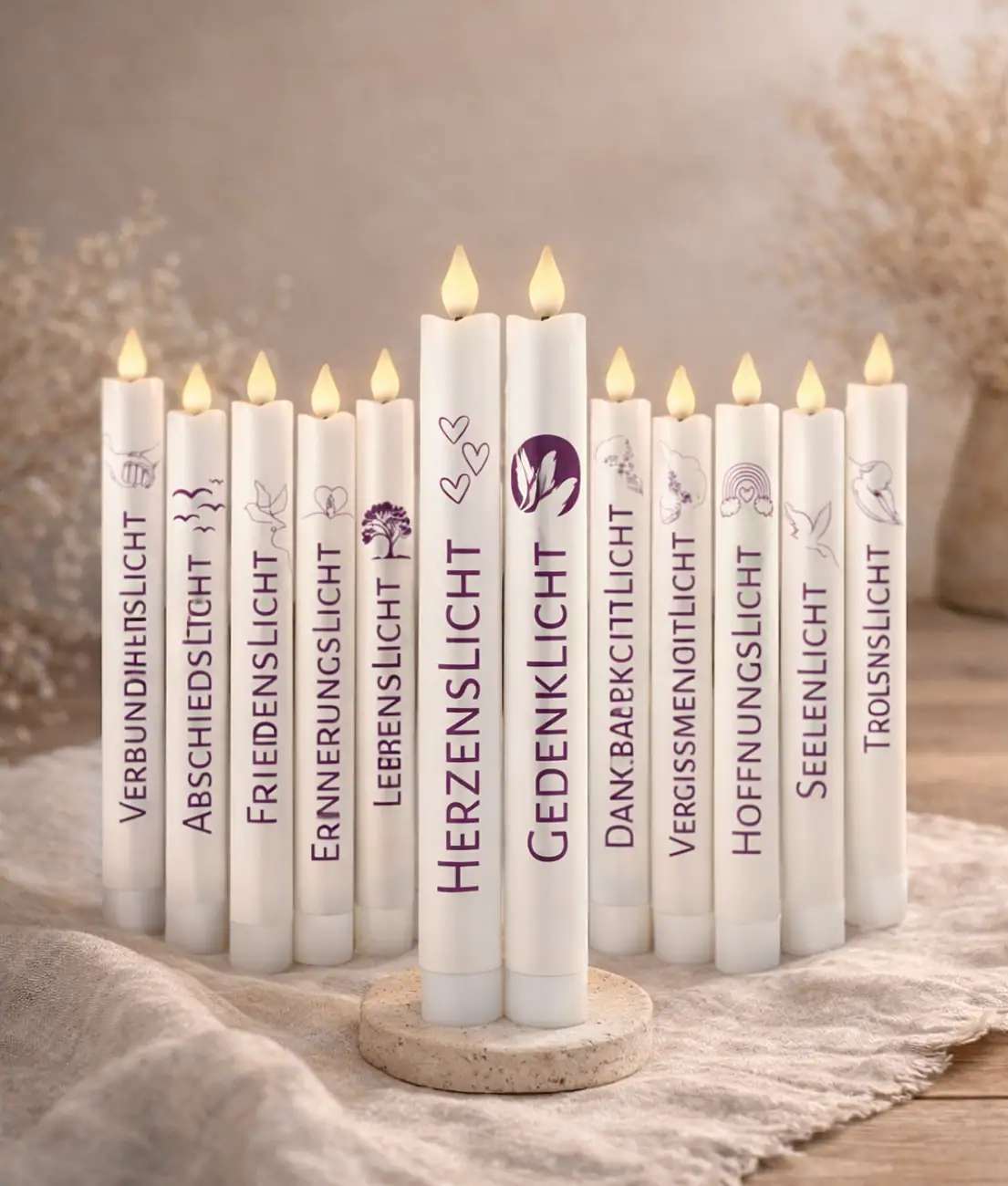 Gedenklichter – Stabkerzen-Kollektion mit trostspendenden Worten (LED) – Kollektion „Trostspendende Worte“: Unsere stilvolle LED-Stabkerze aus echtem Wachs trägt eines von zwölf bedeutungsvollen Worten: Erinnerung, Hoffnung, Trost, Gedenken, Abschied, Seelen, Vergissmeinnicht, Herzen, Dankbarkeit, Frieden, Schutz oder Leben. Jedes dieser Worte symbolisiert eine Facette des Gedenkens und spendet in schweren Zeiten Trost. Diese besondere Kerze ist mehr als nur ein Licht – sie steht für die unvergängliche Verbindung zu einem geliebten Menschen. Der sanfte LED-Flackereffekt schafft eine stimmungsvolle Atmosphäre und bringt Hoffnung und Wärme in dunklen Momenten. Dank des modernen Designs bleibt die Kerze ohne Wachsverlust erhalten und begleitet Sie als dauerhaftes Erinnerungsstück. Farben können angepasst werden, um eine persönliche Gestaltung zu schaffen.