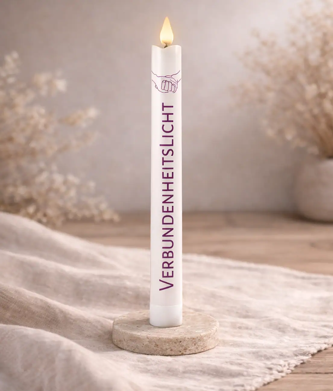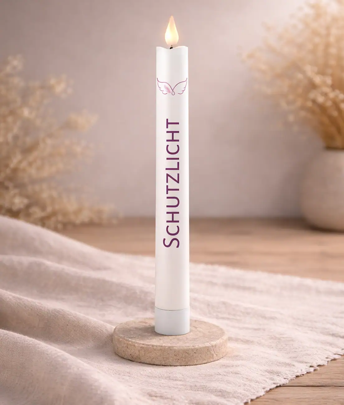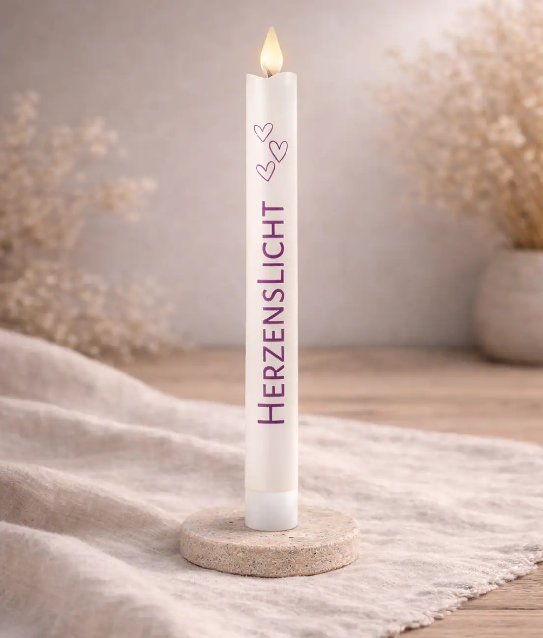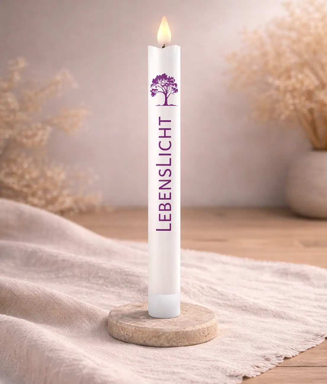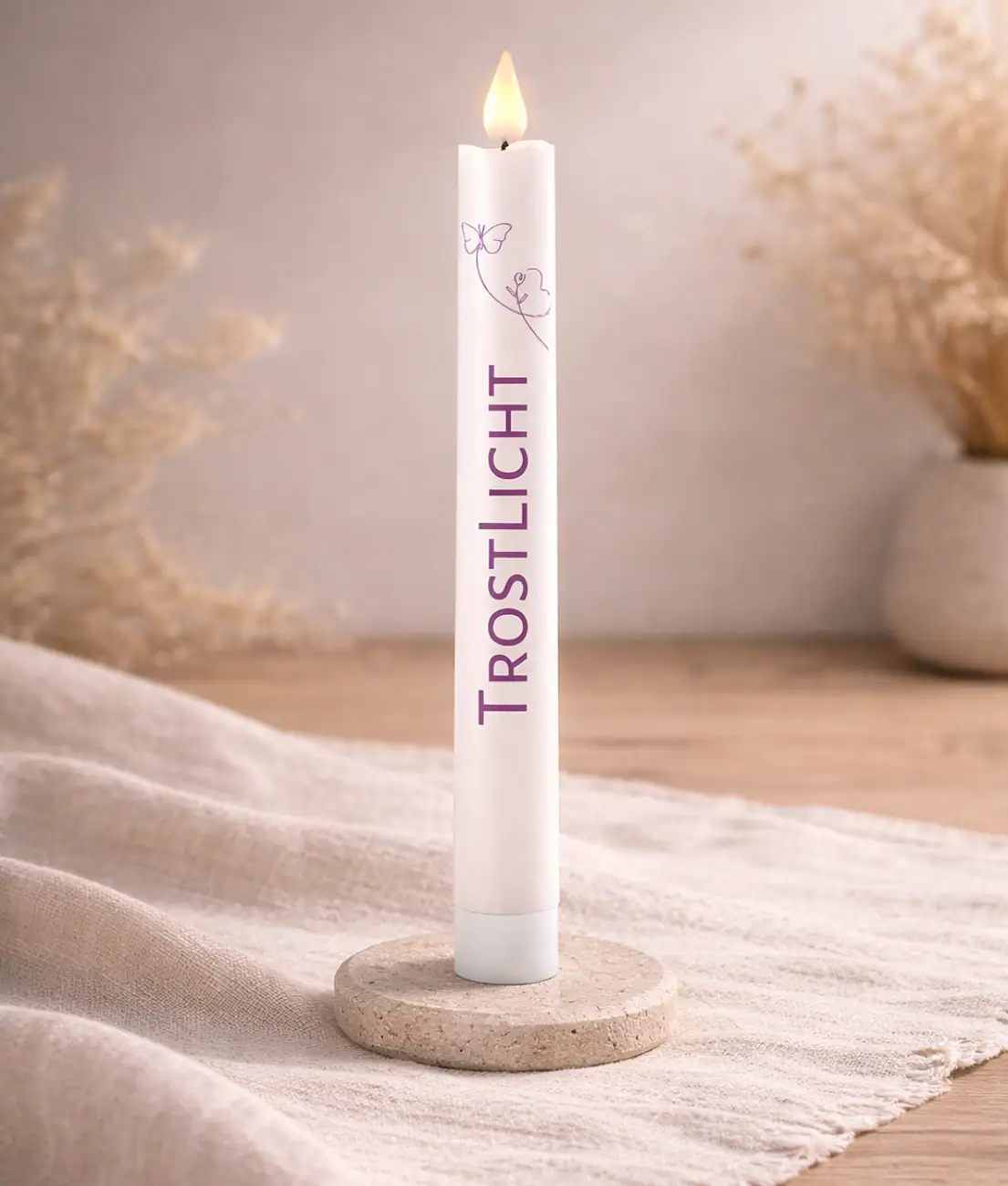Gedenklichter – Stabkerzen-Kollektion mit trostspendenden Worten (LED) – Kollektion „Trostspendende Worte“: Unsere stilvolle LED-Stabkerze aus echtem Wachs trägt eines von zwölf bedeutungsvollen Worten: Erinnerung, Hoffnung, Trost, Gedenken, Abschied, Seelen, Vergissmeinnicht, Herzen, Dankbarkeit, Frieden, Schutz oder Leben. Jedes dieser Worte symbolisiert eine Facette des Gedenkens und spendet in schweren Zeiten Trost. Diese besondere Kerze ist mehr als nur ein Licht – sie steht für die unvergängliche Verbindung zu einem geliebten Menschen. Der sanfte LED-Flackereffekt schafft eine stimmungsvolle Atmosphäre und bringt Hoffnung und Wärme in dunklen Momenten. Dank des modernen Designs bleibt die Kerze ohne Wachsverlust erhalten und begleitet Sie als dauerhaftes Erinnerungsstück. Farben können angepasst werden, um eine persönliche Gestaltung zu schaffen.