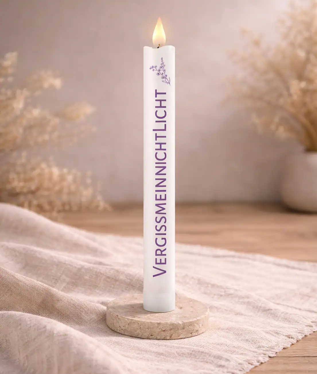 Die schlichte Eleganz der Stabkerze unterstreicht die Würde des Gedenkens, während die spezielle Drucktechnik für gestochen scharfe Texte und außergewöhnlich klare Verläufe sorgt. Farben wirken kraftvoll und wirken dank innovativer Tinten-Technologie und Druck auf Echtwachs besonders eindrucksvoll, sodass die Kerze ein dauerhaftes Erinnerungsstück bleibt. Lassen Sie diese Kerze ein stilles, aber kraftvolles Symbol für die Verbundenheit mit Ihren Liebsten sein – eine Lichtquelle, die über den Moment hinaus Bestand hat.