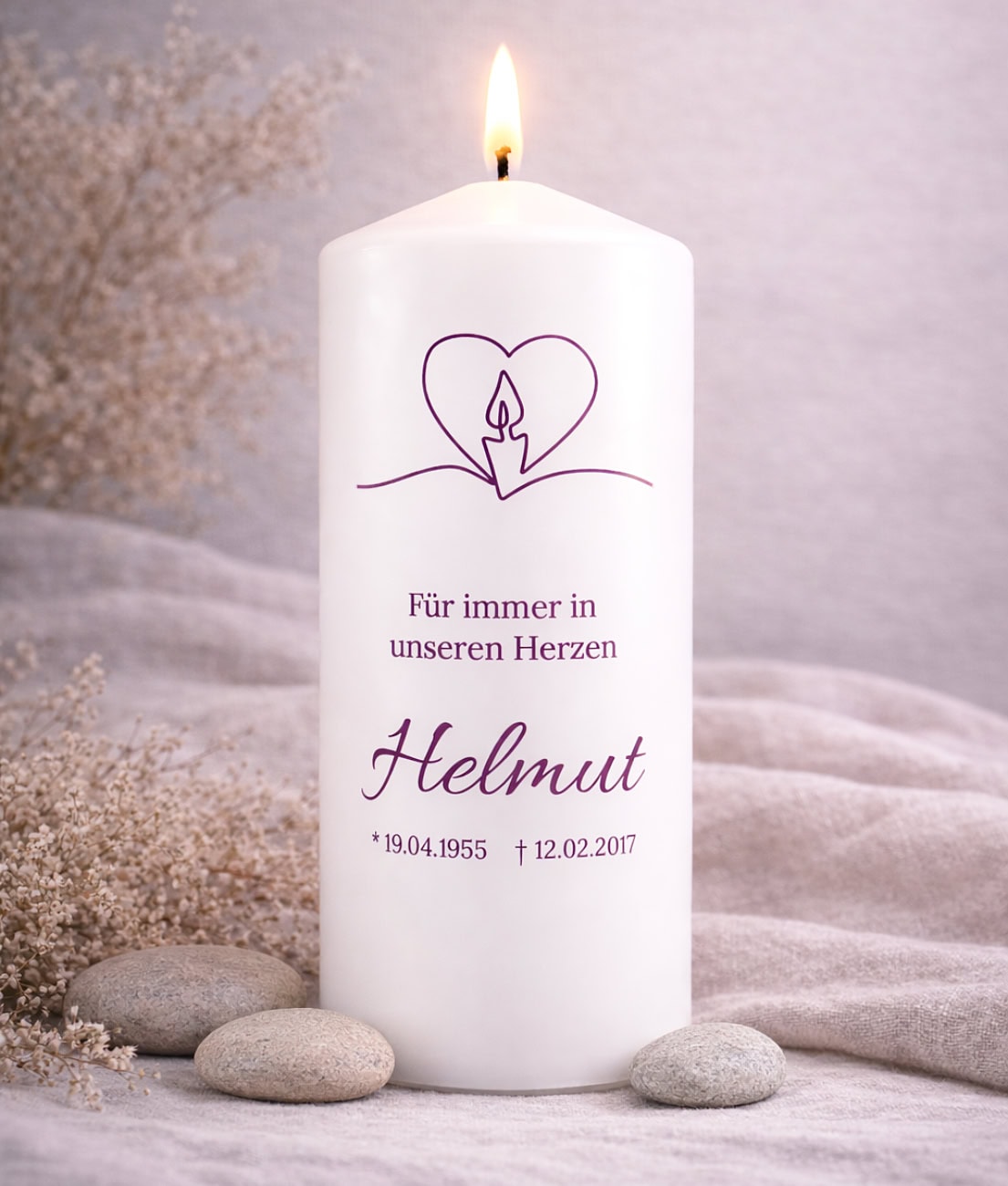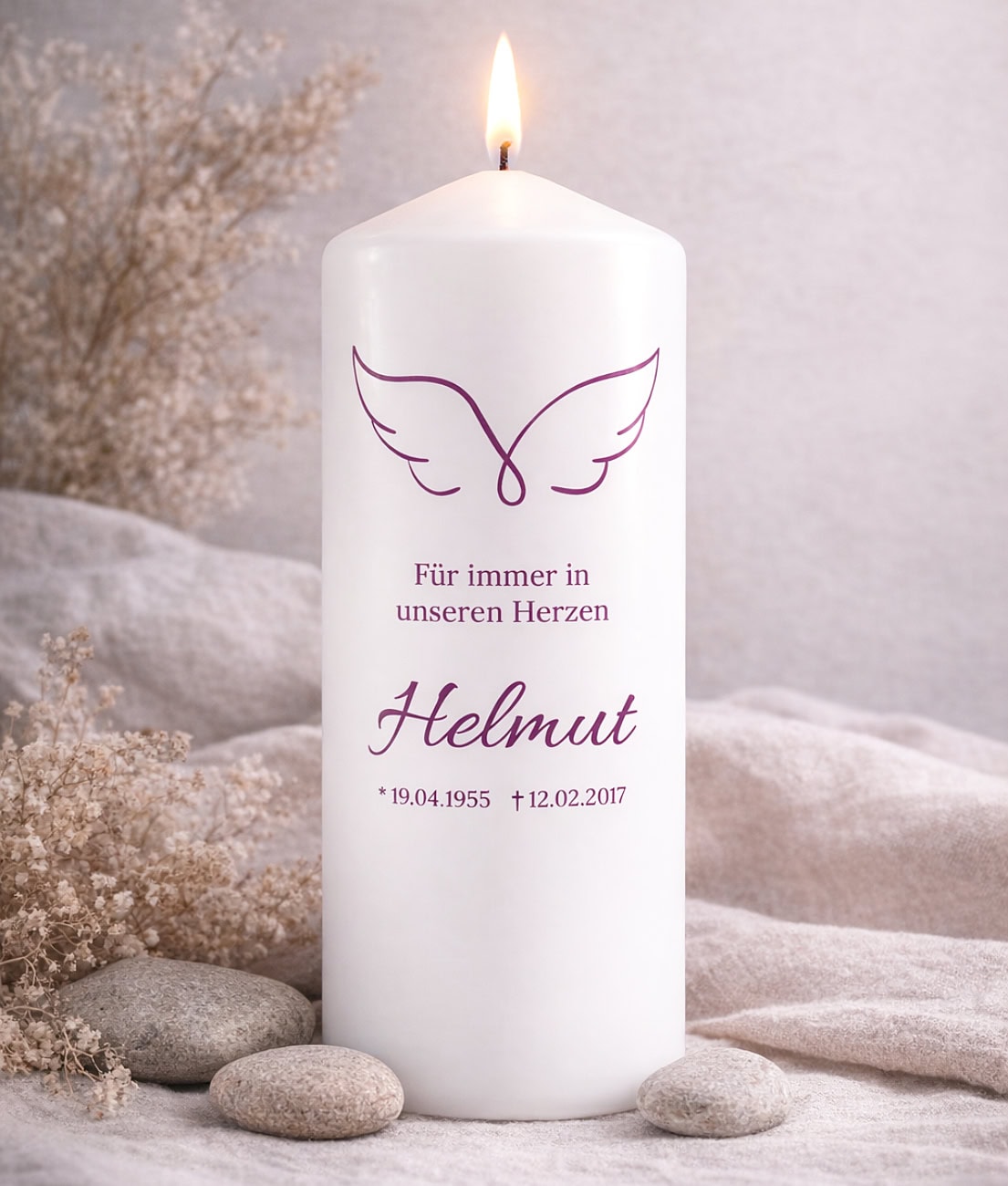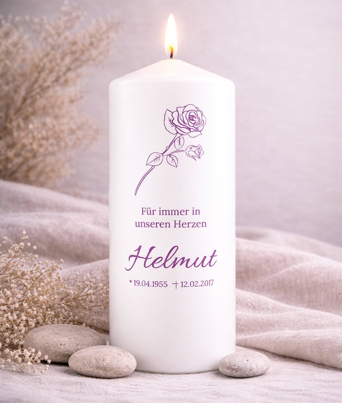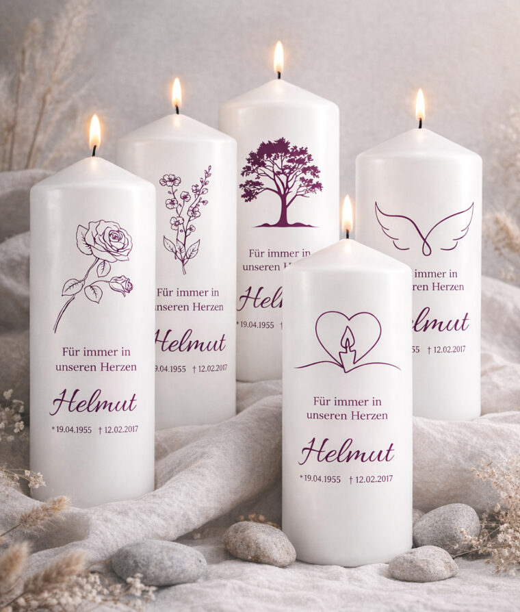Besonders individuell wird die Kerze durch die Personalisierung mit Name, Geburts- und Sterbedatum sowie einem persönlichen Gedenktext. Beliebte Texte sind beispielsweise „Für immer in unseren Herzen“, „In liebevoller Erinnerung“ oder ein ganz persönlicher Abschiedsspruch.