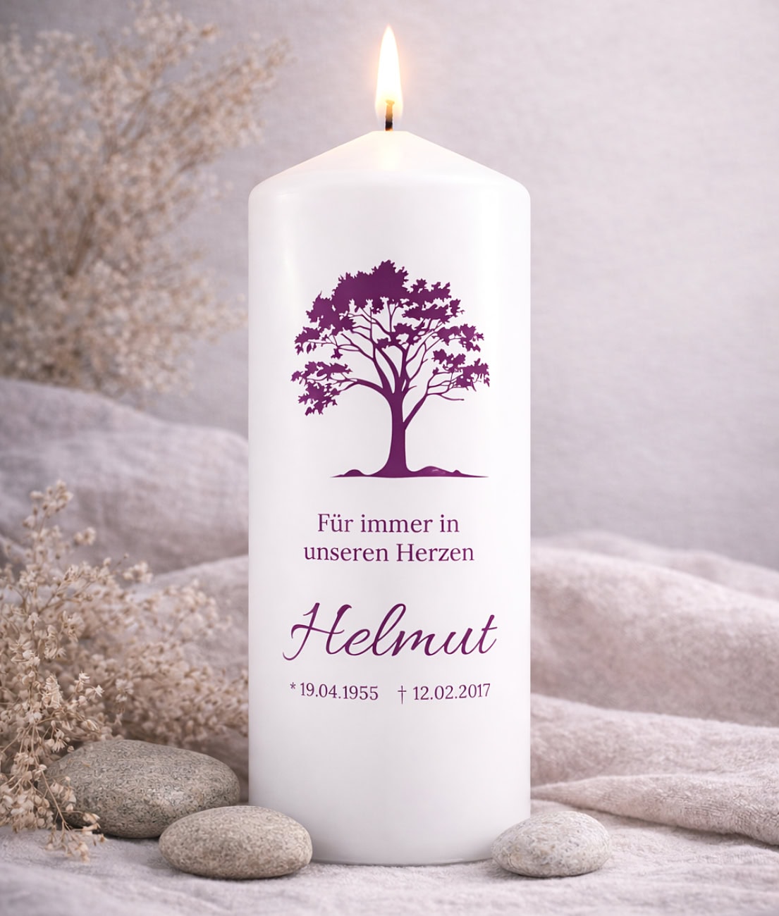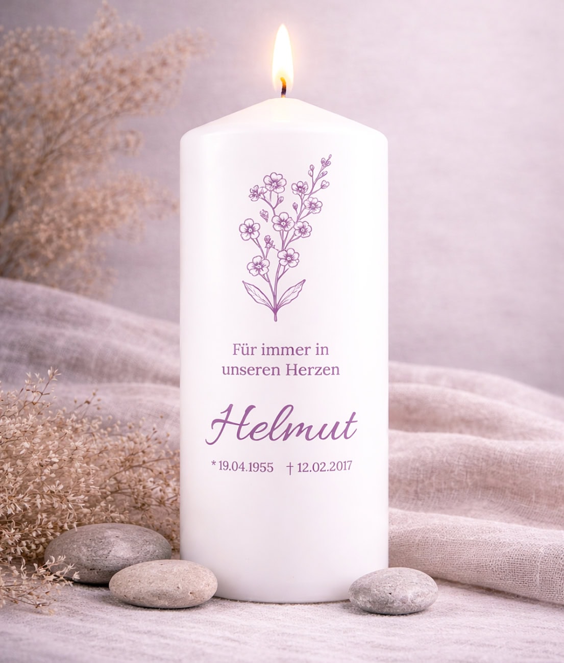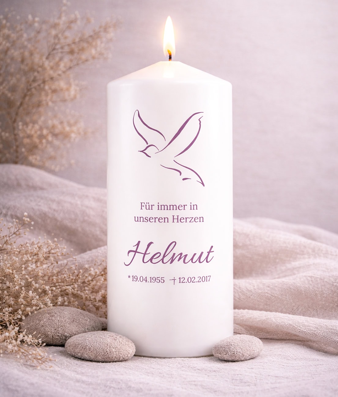 Besonders individuell wird die Kerze durch die Personalisierung mit Name, Geburts- und Sterbedatum sowie einem persönlichen Gedenktext. Beliebte Texte sind beispielsweise „Für immer in unseren Herzen“, „In liebevoller Erinnerung“ oder ein ganz persönlicher Abschiedsspruch.