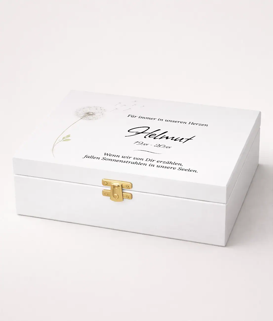 Ein besonderes Gestaltungselement dieser Erinnerungsbox für Trauerandenken ist das dezente auf dem Deckel. Die Pusteblume steht symbolisch für Erinnerung, Loslassen und die Verbundenheit über den Tod hinaus. Die davonfliegenden Samen erinnern daran, dass Erinnerungen weitergetragen werden und ein geliebter Mensch im Herzen weiterlebt.
